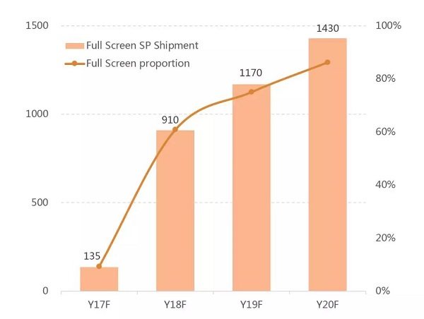 根據(jù)群智咨詢(Sigmaintell)的預(yù)測(cè),2017年全球全面屏智能手機(jī)的出貨將超過1.3億部,而2018年將是全面屏手機(jī)全面爆發(fā)的一年,出貨量將達(dá)到9.1億部,全面屏產(chǎn)品在智能手機(jī)中的滲透率將達(dá)到61%。預(yù)計(jì)至2020年,全球全面屏智能手機(jī)出貨量將達(dá)到14.3億部,滲透率超過85%。